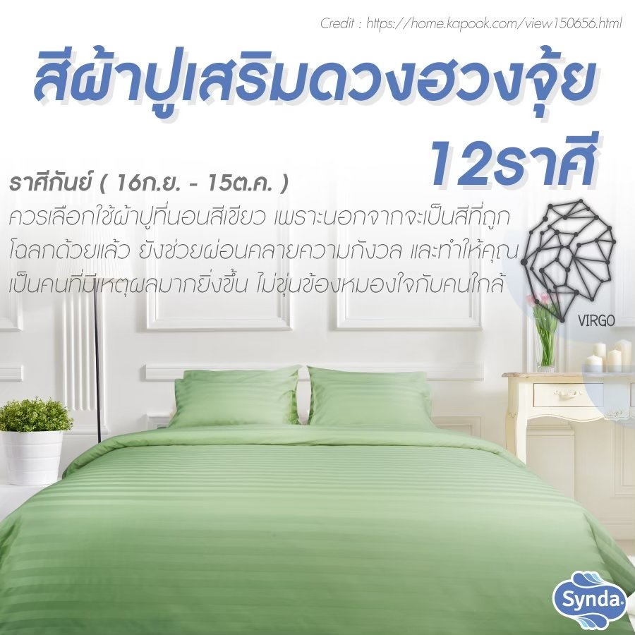 ชาวราศีกันย์รักความสงบและเป็นนักรักสันติภาพตัวยง จริงจังกับทุกอย่าง รักความสมบูรณ์แบบ จึงส่งผลให้ชาวราศีนี้เครียดง่ายจนเกินไป ควรเลือกใช้ผ้าปูที่นอนสีเขียว เพราะนอกจากจะเป็นสีที่ถูกโฉลกด้วยแล้ว ยังช่วยผ่อนคลายความกังวล และทำให้คุณเป็นคนที่มีเหตุผลมากยิ่งขึ้น ไม่ขุ่นข้องหมองใจกับคนใกล้ตัวง่าย ๆ อีกด้วย