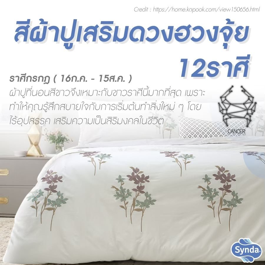 จากสัญลักษณ์รูปปูบ่งบอกว่าชาวราศีกรกฎเป็นคนที่มีเมตตา รักใครรักจริง และที่สำคัญชอบปกป้องดูแลคนรอบข้างอยู่เสมอ แต่อีกมุมกลับเป็นคนที่อ่อนไหวง่าย ชอบเก็บทุกสิ่งทุกอย่างมาคิด ฉะนั้นผ้าปูที่นอนสีขาวจึงเหมาะกับชาวราศีนี้มากที่สุด เพราะทำให้คุณรู้สึกสบายใจกับการเริ่มต้นทำสิ่งใหม่ ๆ โดยไร้อุปสรรค เสริมความเป็นสิริมงคลในชีวิต และช่วยส่องประกายความโดดเด่นในตัวคุณออกมา