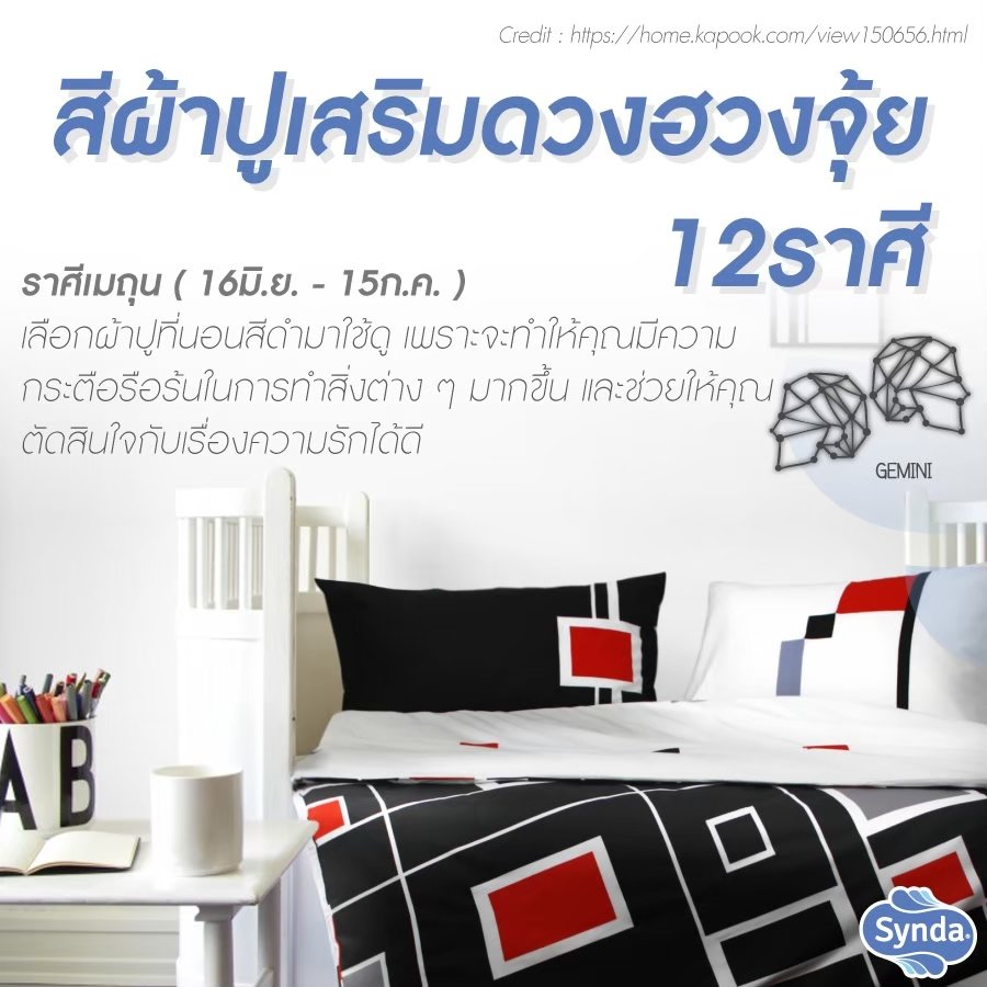 ชาวราศีเมถุนเป็นนักสื่อสารที่ดี ช่างพูดช่างคุย และฉลาด แต่ถ้าเป้าหมายไม่ประสบความสำเร็จ คุณก็อาจจะกลายเป็นคนที่คิดฟุ้งซ่านไปเลยก็ได้ ลองเลือกผ้าปูที่นอนสีดำมาใช้ดู เพราะจะทำให้คุณมีความกระตือรือร้นในการทำสิ่งต่าง ๆ มากขึ้น และช่วยให้คุณตัดสินใจกับเรื่องความรักได้ดี