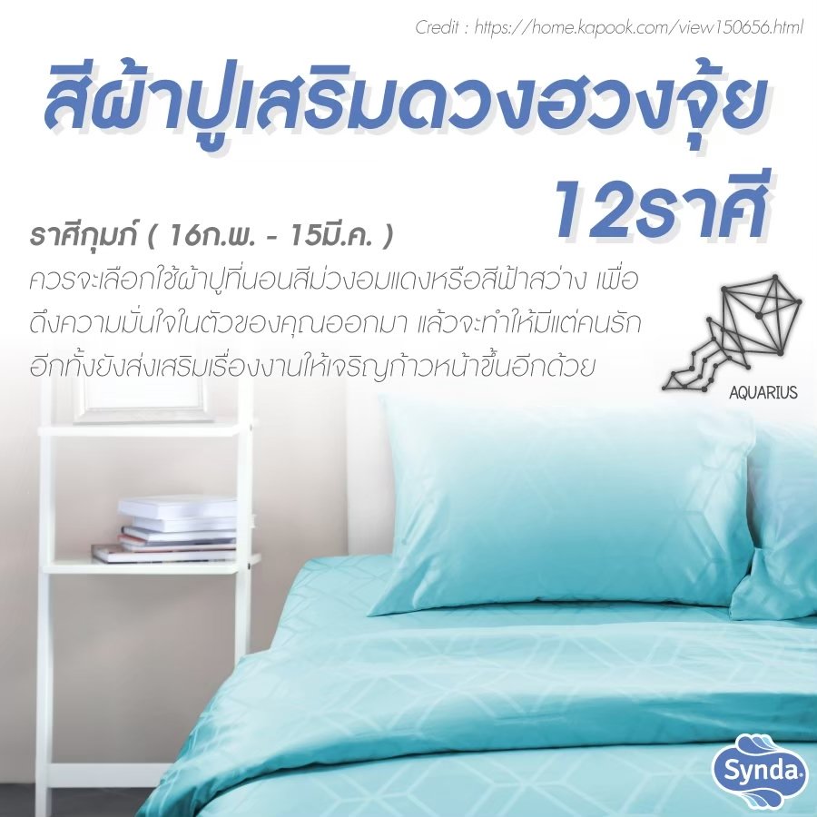 พื้นฐานของชาวราศีกุมภ์เป็นคนอัธยาศัยดี ร่าเริง และมีเมตตาต่อผู้อื่น หรือเรียกได้ว่าเป็นแม่พระของทุกคนเลยก็ได้ค่ะ แต่ชาวราศีนี้จะมีกำแพงบาง ๆ ปิดกั้นตัวเอง รวมไปถึงความสดใส ความร่าเริง และความสามารถของตนเองเอาไว้ ดังนั้นควรจะเลือกใช้ผ้าปูที่นอนสีม่วงอมแดงหรือสีฟ้าสว่าง เพื่อดึงความมั่นใจในตัวของคุณออกมา แล้วจะทำให้มีแต่คนรัก อีกทั้งยังส่งเสริมเรื่องงานให้เจริญก้าวหน้าขึ้นอีกด้วย