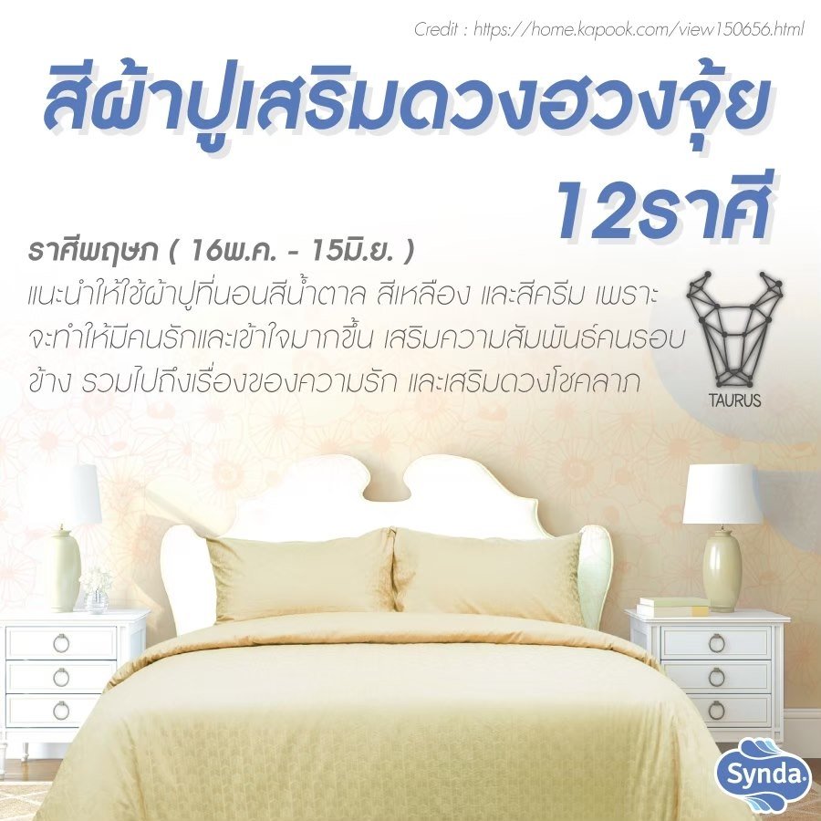 ชาวราศีพฤษภเป็นคนรักสุนทรี ชอบศิลปะและดนตรี ชอบช่วยเหลือคนรอบข้าง เป็นมิตรที่ดีของเพื่อน ๆ มีความซื่อสัตย์ และยึดมั่นในตัวเองสูง แต่การยึดมั่นก็อาจจะทำให้ชาวราศีนี้ดูเป็นคนหัวแข็งจนเกินไป จนลืมสนใจความรู้สึกของคนรอบข้าง แนะนำให้ใช้ผ้าปูที่นอนสีน้ำตาล สีเหลือง และสีครีม เพราะจะทำให้มีคนรักและเข้าใจมากขึ้น เสริมความสัมพันธ์ระหว่างคนรอบข้างให้ยิ่งแน่นแฟ้น รวมไปถึงเรื่องของความรัก และเสริมดวงโชคลาภ