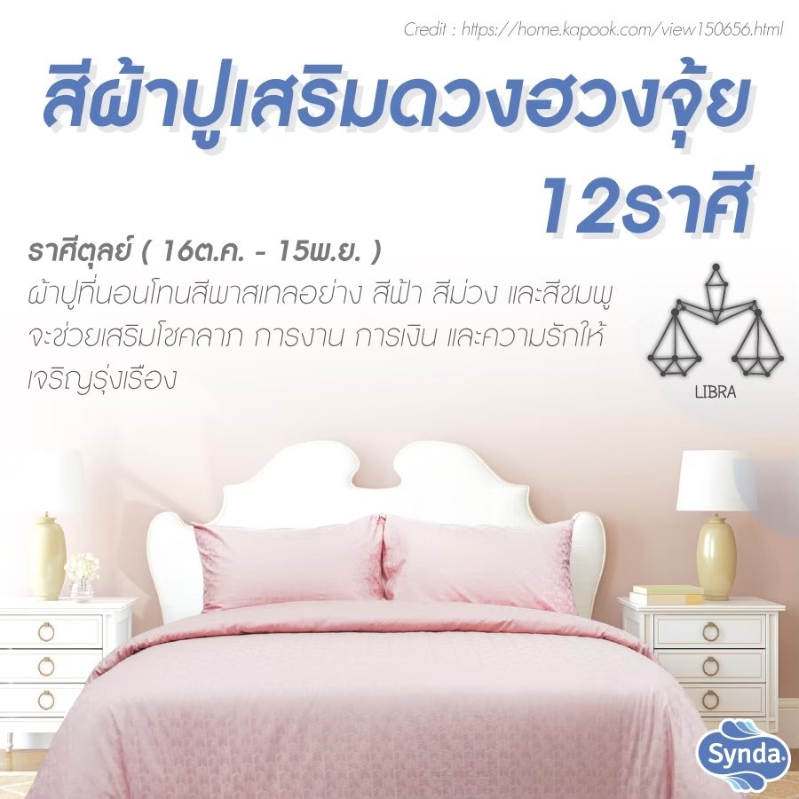 คงไม่มีราศีไหนที่ยึดถือความยุติธรรมนำหน้าได้เท่าราศีตุลย์อีกแล้วล่ะ เพราะพวกเขาสามารถให้เหตุและผลได้เสมอ แถมยังเป็นชาวราศีที่มีเสน่ห์น่าหลงใหล และชอบความสมบูรณ์แบบ แต่บางครั้งก็ยังสับสนในใจบ้าง ฉะนั้นผ้าปูที่นอนโทนสีพาสเทลอย่าง สีฟ้า สีม่วง และสีชมพู จะช่วยเสริมโชคลาภ การงาน การเงิน และความรักให้เจริญรุ่งเรือง